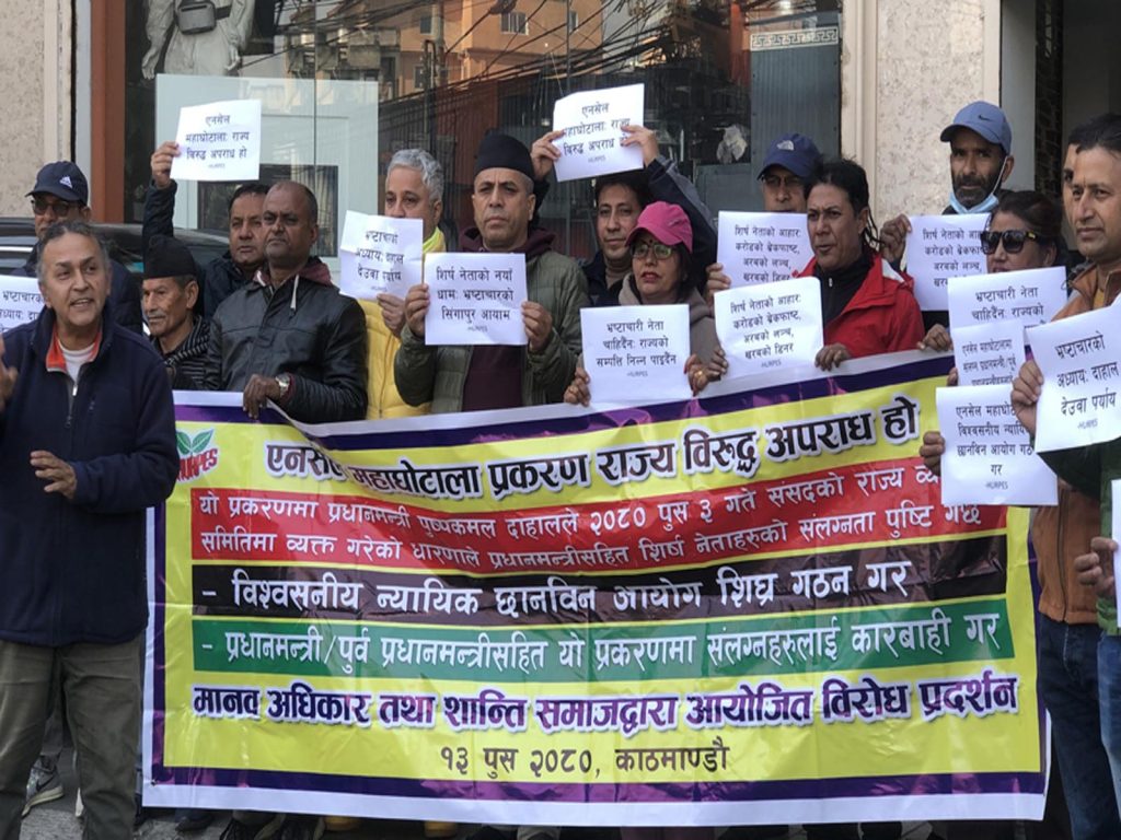 घोटाला प्रकरणमा प्रधानमन्त्रीसहित विभिन्न राजनीतिक दलका शीर्ष नेताहरुकै संलग्नताको तथ्य बारम्बार प्रकाशमा आएको भन्दै शान्ति समाजले विश्वसनीय न्यायीक छानविन आयोगको माग गर्दै आएको छ ।