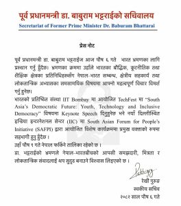 पूर्वप्रधानमन्त्री डा. बाबुराम भट्टराई आज भारत भ्रमणमा जाँदै